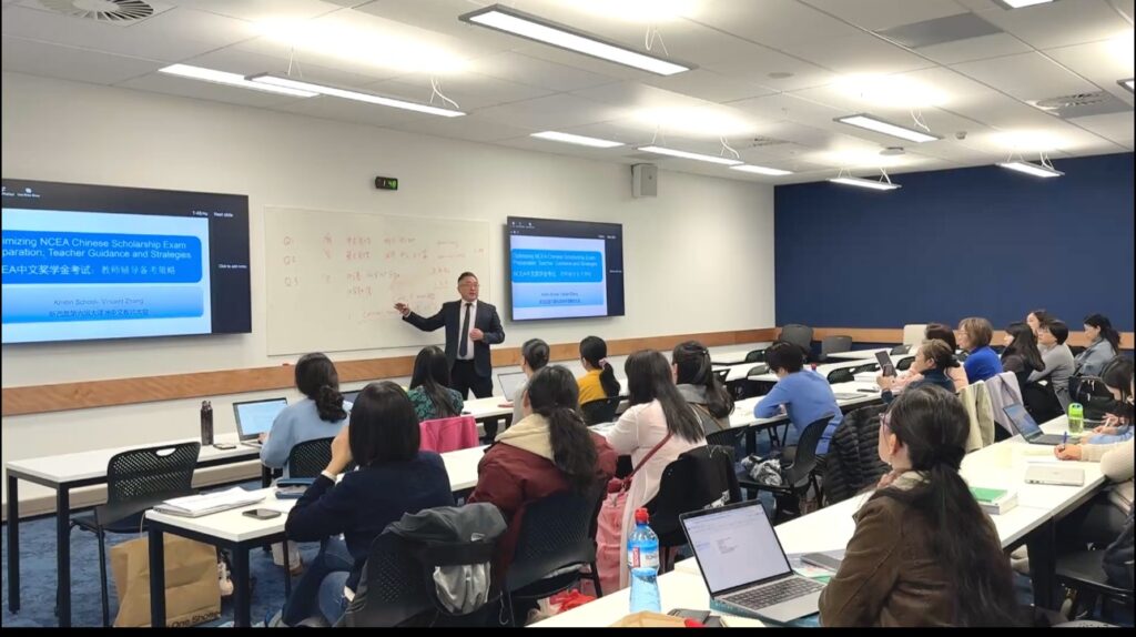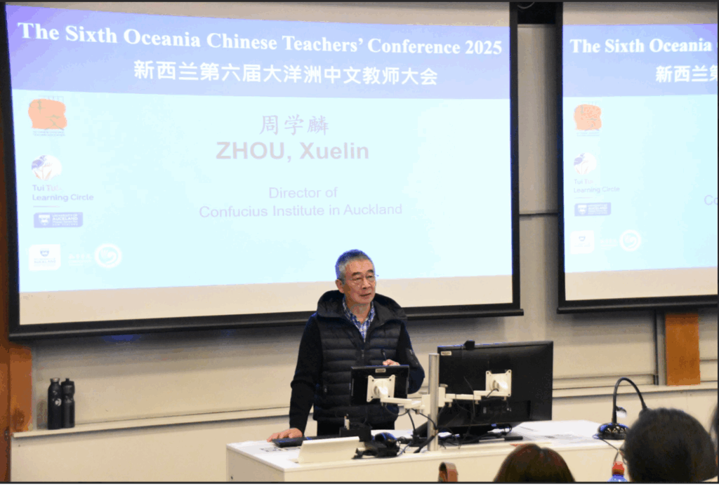 奥克兰大学中文系副教授王丹平博士作题为《人工智能与中文教学的未来》的主旨演讲,探讨AI技术在语言教学中的应用前景,引发与会者的热烈讨论。下午的会议设置了12场专题工作坊,内容涵盖课堂教学方法、中国文化活动组织及考试评估等议题,参会教师积极分享教学经验,现场交流氛围热烈。
